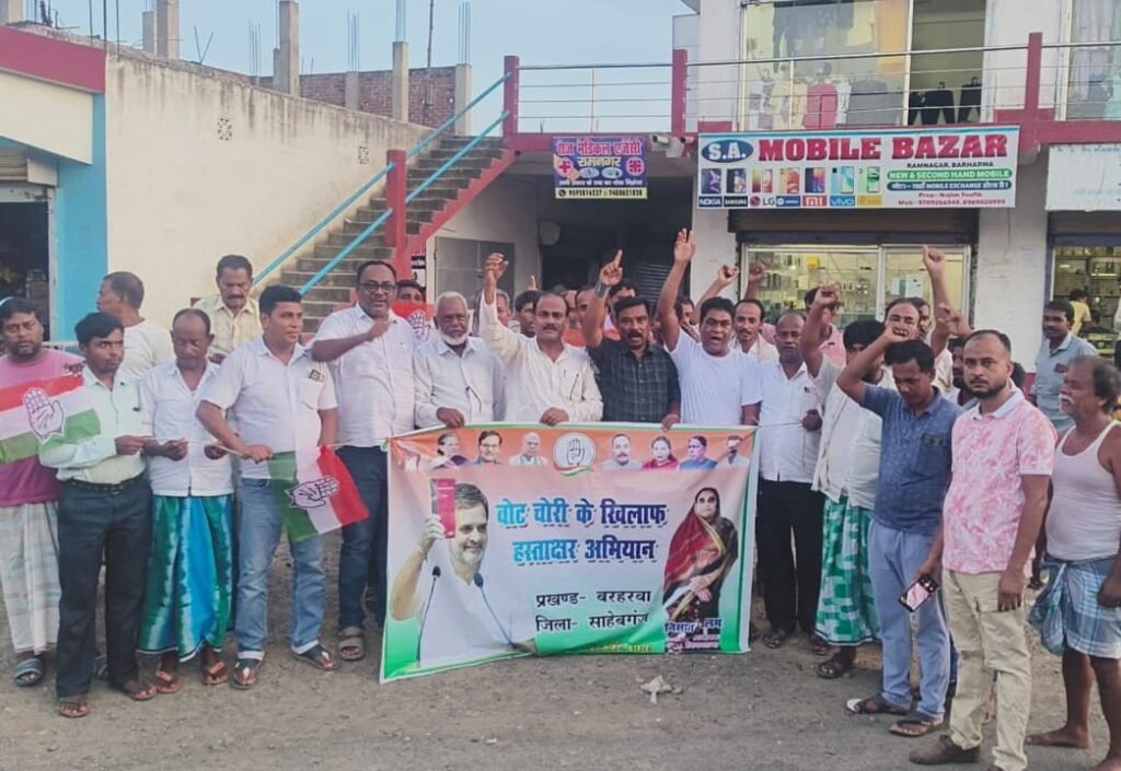 साहिबगंज जिला अंतर्गत बरहरवा प्रखण्ड के रामनगर पंचायत में गुरुवार को जिला कांग्रेस अध्यक्ष सह विधायक प्रतिनिधि बरकत खान के नेतृत्व में “वोट चोरी रोकने” को लेकर एक हस्ताक्षर अभियान चलाया गया। इस अभियान में बड़ी संख्या में कार्यकर्ताओं और ग्रामीणों ने हिस्सा लिया।