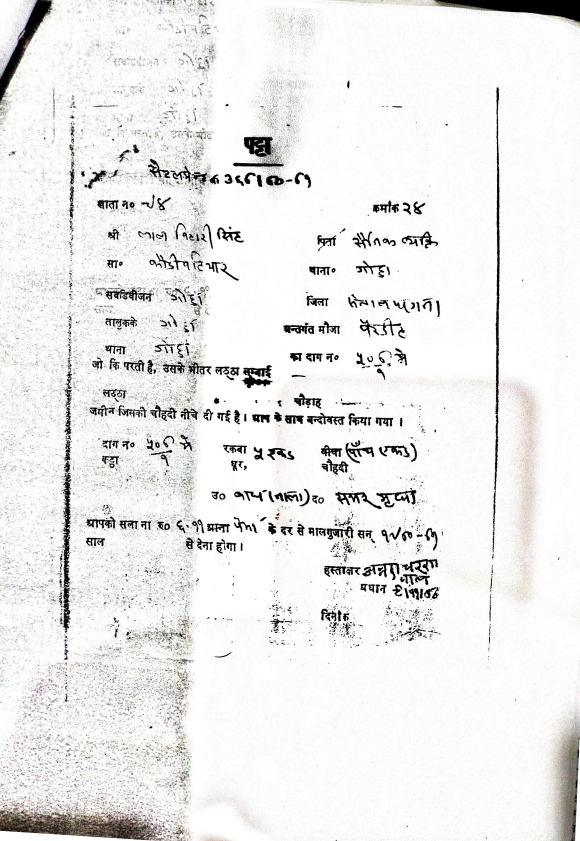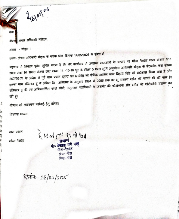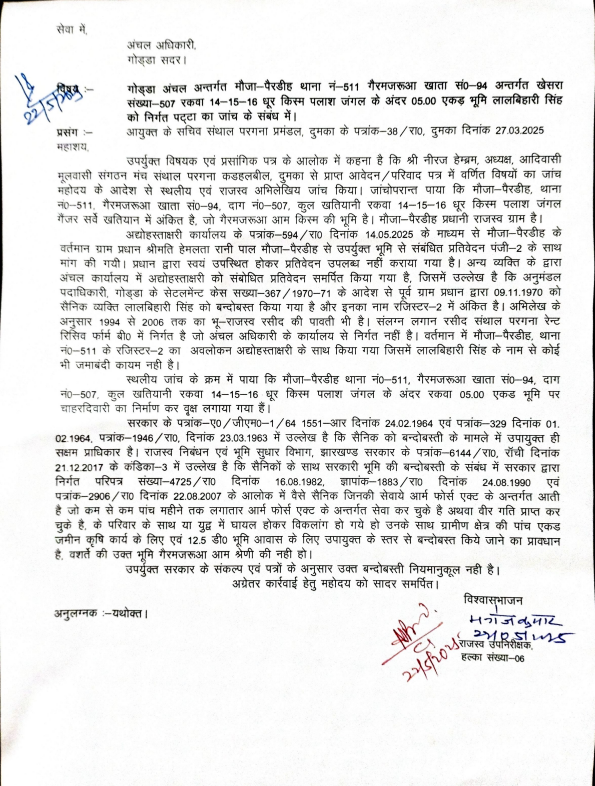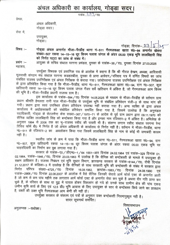 दरअसल, नीरज हेम्ब्रम जो कि संथाल परगना आदिवासी मूलवासी मंच के अध्यक्ष है उन्होंने अंचलाधिकारी गोड्डा को आवेदन देकर इस मामले में अविलंब जाँच कराने की मांग की थी। जिसमें उन्होंने यह लिखा है कि गैरमजरूआ जमीन जो कि गैंजर सर्वे खतियान में पलाश जंगल के रूप में उल्लेखित है, ग्राम प्रधान द्वारा लालबिहारी सिंह के नाम से बंदोबस्त कर दिया गया है। मामला गोड्डा जिला अंतर्गत सदर प्रखंड के ग्राम पैर डीह का है। ग्राम पैरडीह मौजा-पैरडीह एक प्रधानी राजस्व गाँव है। ग्राम प्रधान हेमलता रानी पाल से जब उपर्युक्त भूमि से संबंधित प्रतिवेदन को पंजी-2 के साथ।मांग की गई तो प्रधान द्वारा स्वयं उपस्थित ना होकर अन्य व्यक्ति द्वारा अंचलाधिकारी कार्यालय को प्रतिवेदन समर्पित कर जानकारी मुहैया कराई गई। जिसमें उल्लेख है कि अनुमंडल पदाधिकारी गोड्डा के सेटलमेंट केस संख्या-367/1970-71 के आदेश से पूर्व ग्राम प्रधान द्वारा 09 नवम्बर 1970 को उक्त व्यक्ति लालबिहारी सिंह को जो उस समय सैनिक के रूप में था, के नाम बंदोबस्त किया गया है और इनका नाम रजिस्टर-2 में अंकित है। प्रधान द्वारा प्राप्त कराये गए सूचना के बाद जब अंचलाधिकारी द्वारा वर्तमान में जब मौजा- पैरडीह, थाना न०-511 के रजिस्टर-2 का अवलोकन किया गया तो पाया गया कि प्रधान द्वारा जो भी जानकारी दी गयी थी वह बिल्कुल गलत है। रजिस्टर-2 में लालबिहारी सिंह के नाम से कोई भी जमाबंदी कायम नहीं है।