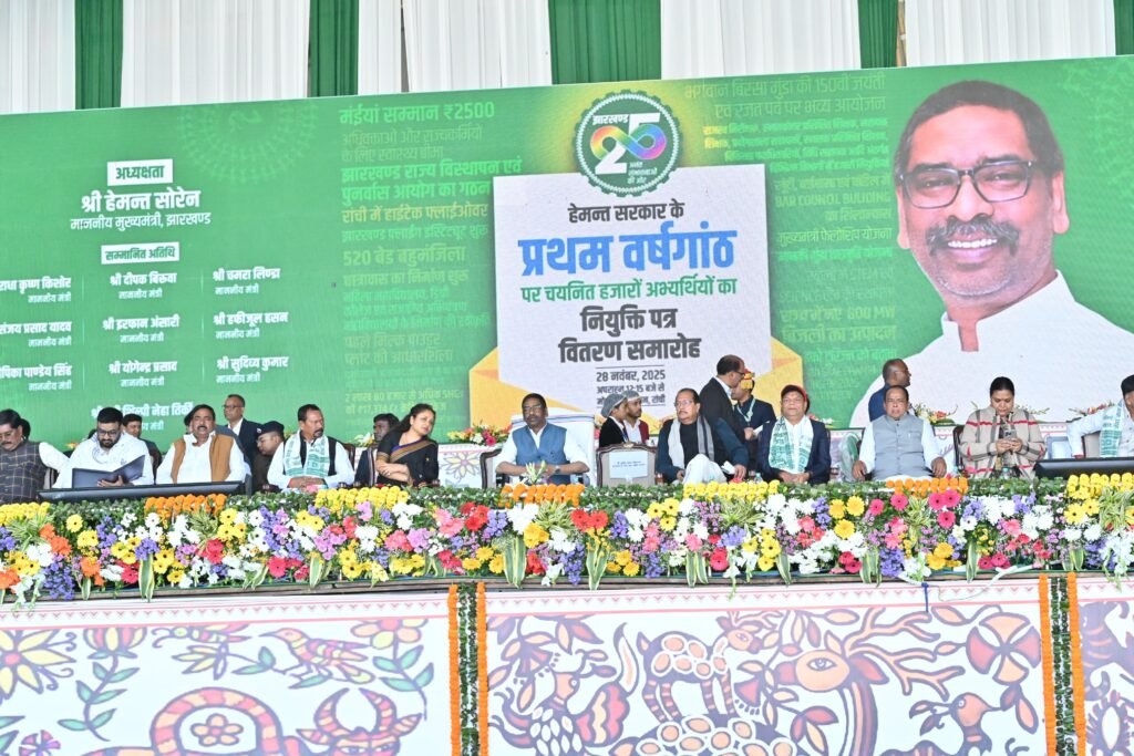 मुख्यमंत्री श्री हेमन्त सोरेन ने कहा कि 28 नवंबर 2025 को वर्तमान राज्य सरकार का 1 वर्ष का कार्यकाल पूरा हो रहा है, इस अवसर पर राज्य सरकार द्वारा यहां के 10 हजार से अधिक युवक-युवतियों को सरकारी नियुक्तियां मिल रही है। उन्होंने कहा कि सिर्फ सरकारी नौकरियां ही नहीं बल्कि स्वरोजगार के विभिन्न साधनों का भी सृजन किया जा रहा है। मुख्यमंत्री ने कहा कि हमारी सरकार रांची हेड क्वार्टर से नहीं बल्कि गांव से चलती है। “सेवा का अधिकार” कार्यक्रम के तहत हमारी सरकार योजनाओं को आपके घर आंगन तक पहुंचाने का कार्य कर रही है। आपकी समस्याओं का निदान भी आपके गांव घर पर ही किया जा रहा है। मुख्यमंत्री ने कहा कि सरकारी व्यवस्था में जो भी हक अधिकार आपको मिलना चाहिए हमारी सरकार आप तक पहुंचाने का कार्य कर रही है।
