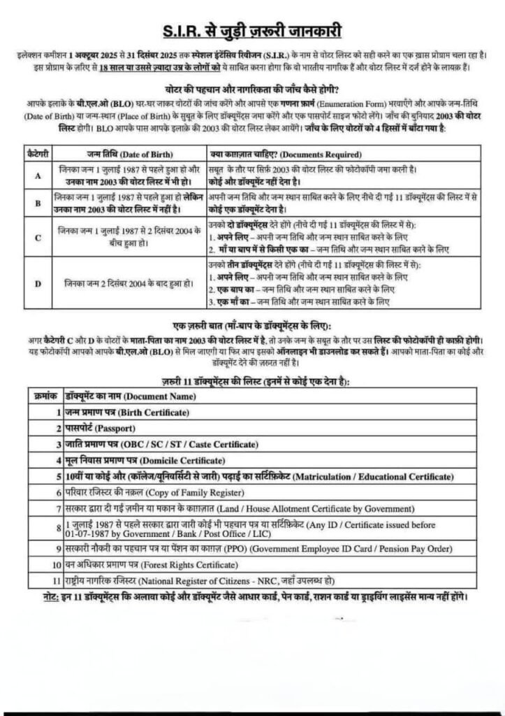 उन्होंने कहा कि मतदाता सूची के विशेष गहन पुनरीक्षण (SIR) का कार्य निर्वाचन प्रक्रिया की नींव है, इसलिए इसमें किसी प्रकार की त्रुटि या लापरवाही बर्दाश्त नहीं की जाएगी। उन्होंने सभी पदाधिकारियों को निर्देशित किया कि कार्य को गंभीरता, सटीकता एवं समयबद्धता के साथ पूरा करें, ताकि आगामी चुनाव के लिए जिले की मतदाता सूची पूर्ण रूप से अद्यतन एवं त्रुटिरहित तैयार की जा सके।