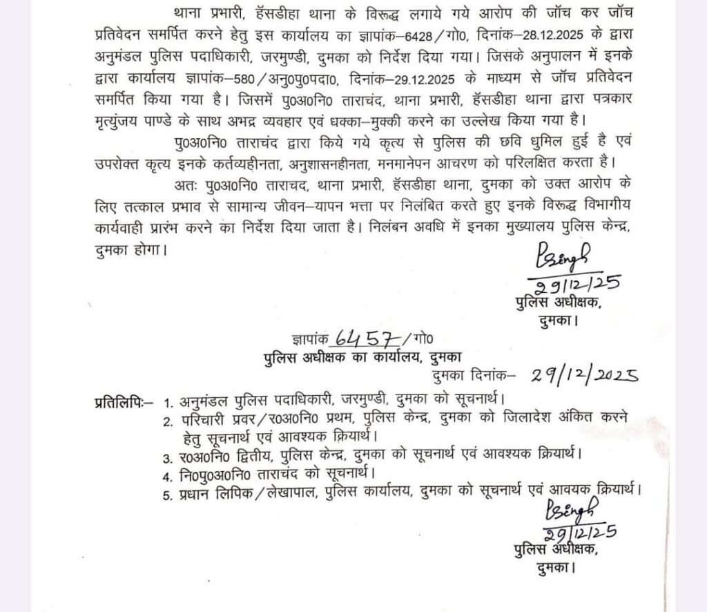 Share Facebook Twitter LinkedIn Pinterest Email दुमका// पत्रकार से दुर्व्यवहार व मारपीट के मामले में हाँसडीहा थाना प्रभारी निलंबित।